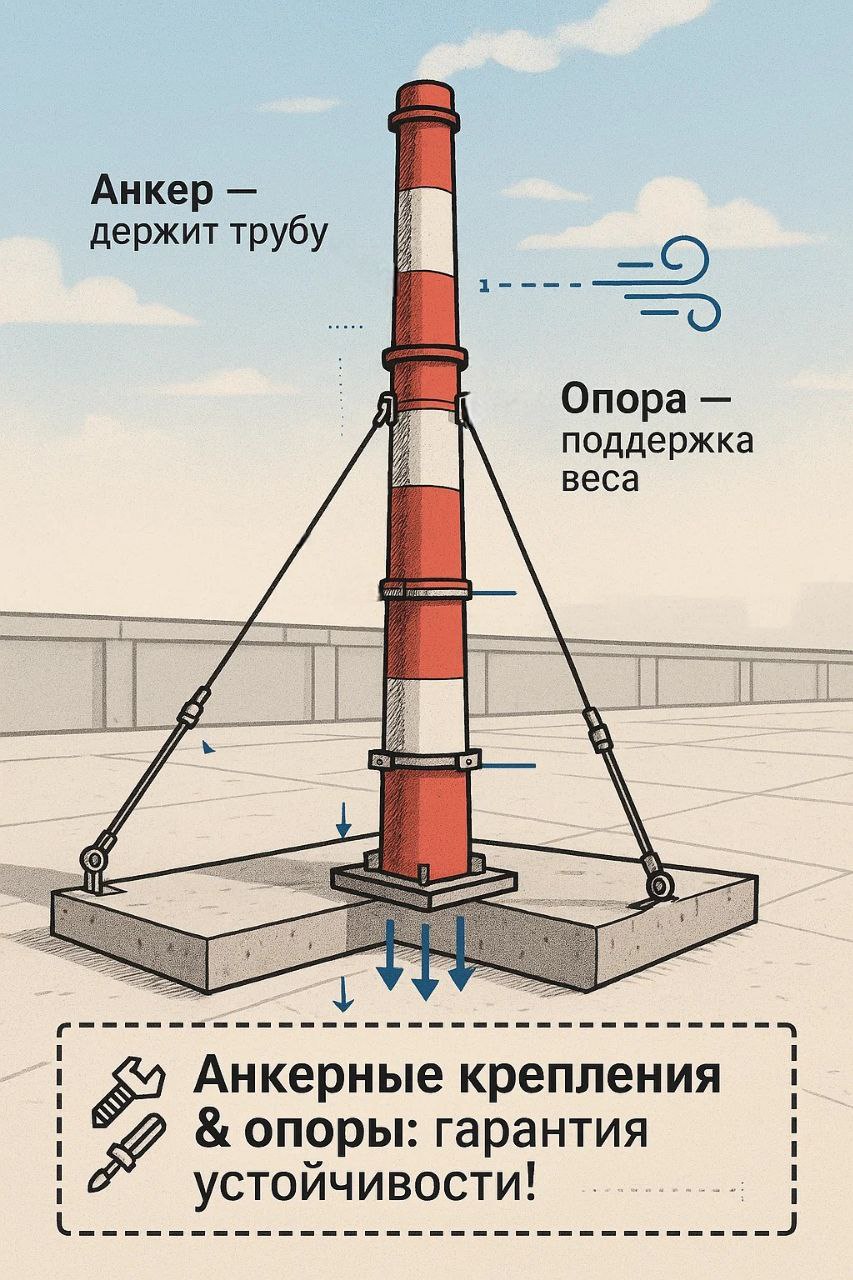 Дымовая труба — это не просто конструкция, которая «дым выпускает». Она должна быть стабильной, безопасной и долговечной. Здесь на сцену выходят анкерные крепления и опоры!