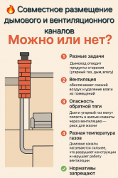 По строительным правилам дымоход и вентиляция должны быть обособлены друг от друга.