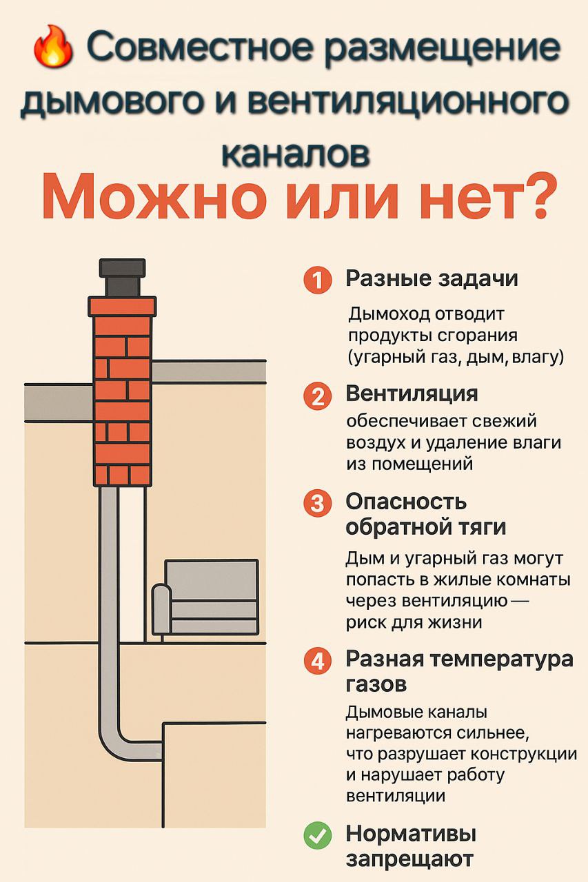 Многие застройщики и домовладельцы задаются этим вопросом, когда хотят «сэкономить место» и объединить каналы. На первый взгляд идея кажется логичной: и дымоход, и вентиляция — это вертикальные каналы для отвода газов.